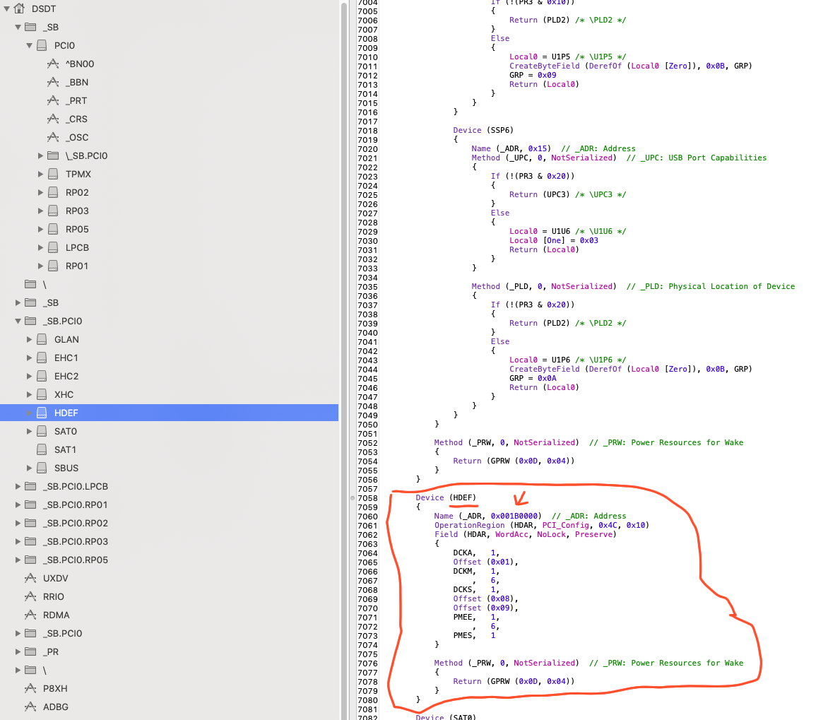 HDMI ist immer das Device HDAU, welches in vielen CleanDSDT's noch nicht einmal vorhanden ist, so in seiner System-DSDT auch nicht. Der eigentliche PCI-Pfad hängt ja hierbei von der Grafik ab, welche HDMI liefert. Hierbei kann es ja HDMI von der Intel-Grafik sein, bzw. von einer verwendeten Nvidia oder AMD.