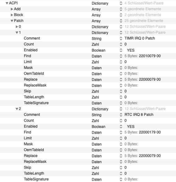 Ferner habe ich folgende IRQ-Patches in meinem OC, baue diese mal in Deiner OC/config.plist ein:
