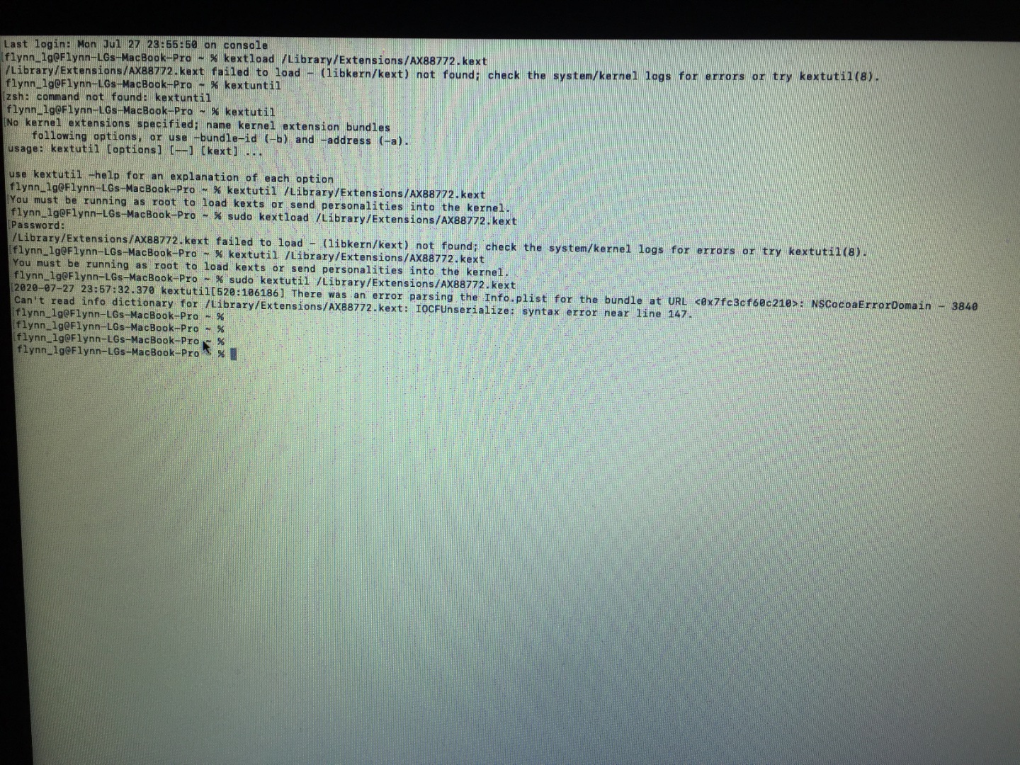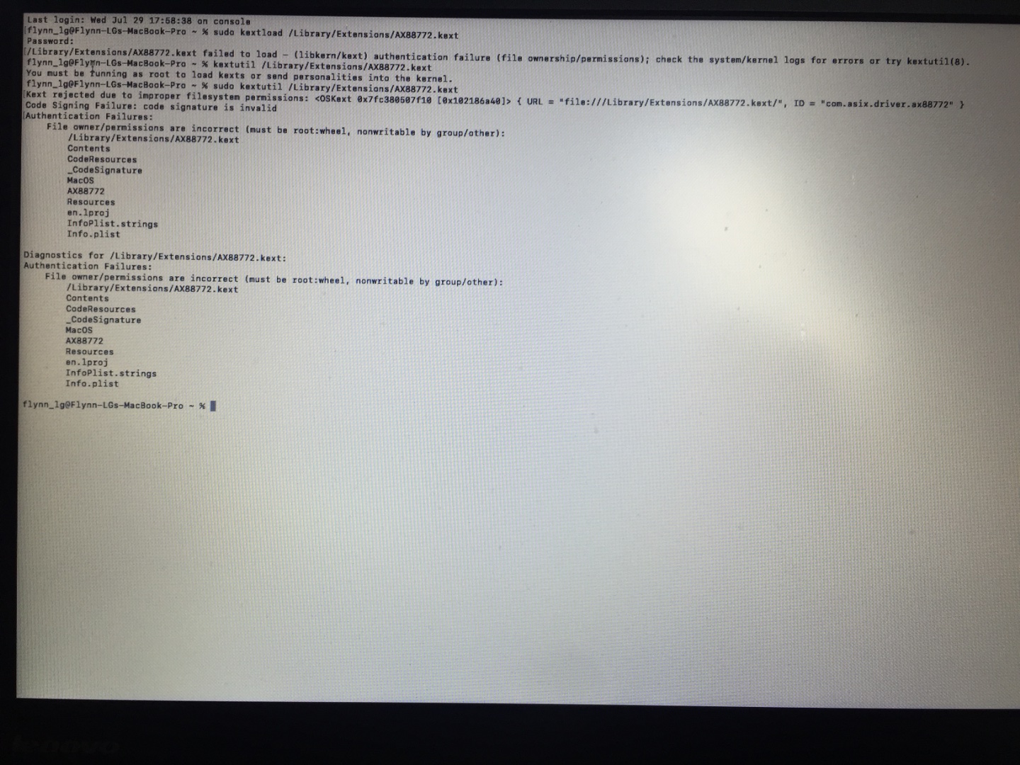 sudo chown 0:0 /Library/Extensions/kextname.kext *enter*
