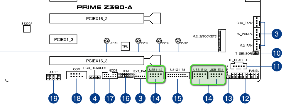 Bei mir hängen die beiden Usb Ports vom Gehäuse am Anschluss USB_E34 und das vom Bluetooth an USB_E12