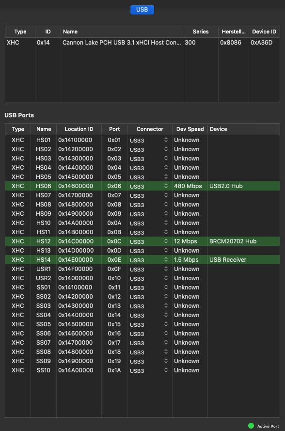 Für mich wird der USB Hub unter dem die Ports USB_E12 und USB_34 laufen irgendwie nicht im Hackintool angezeigt - oder nur zum teil, weil ja auf HS06 was zu sehen ist. Wenn dem so ist, wäre auf jeden Fall das Portlimit überschritten, auch wenn im Hackintool nur 15 Ports zu sehen sind...