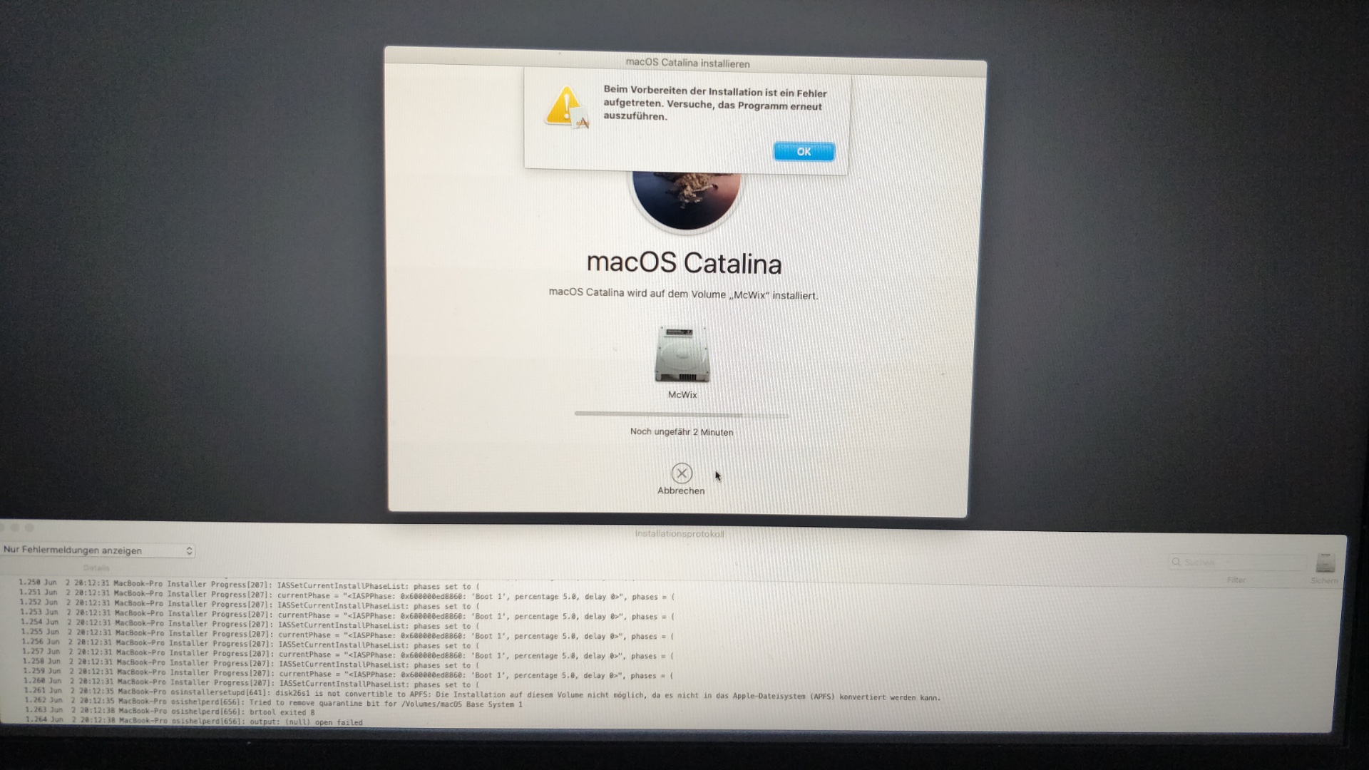 Hi ich habe mir eine Lenovo T470 EFI hier aus dem Forum gezogen. Bootloader und die meisten Kext's habe ich aktualisiert. Ich komme bis zur Installation. Formatiere die NVME zu APFS - GUID. Installation fängt an und bricht dann mit folgendem Fehler ab: