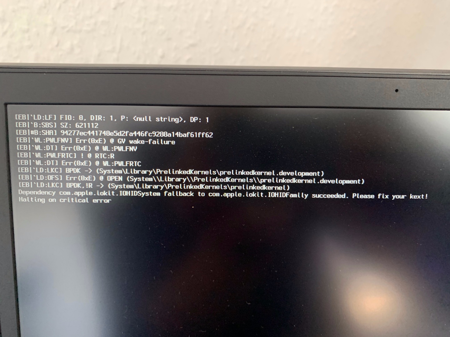 Erstmal : AirportBrcmFixup.kext, NVMeFix.kext, SMCBatteryManager.kext, VoodooHDA.kext, VoodooInput.kext, RealtekRTL8111.kext rausschmeißen.