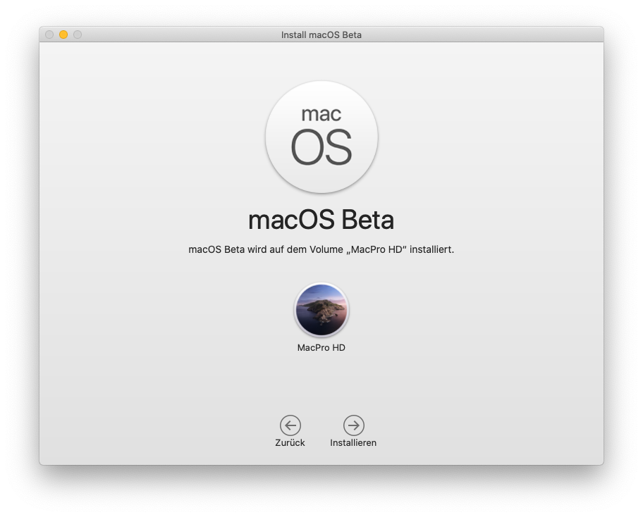 Und fertig ist die Laube! Nach etwas Zeit gibt es den Installer-Stick für das neue Betriebssystem, dass im Moment erstmal so tut, als hieße es macOS Beta.. Wer dieses Programm jetzt auf das einzige System-Volume installiert, ist selbst schuld, davor warnt sogar Apple..
