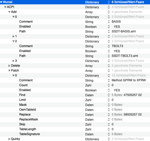 Sollten weitere ACPI-Patches vorhanden sein, raus damit. Auch weitere SSDTs komplett entfernen (AWAC Zeugs etc).