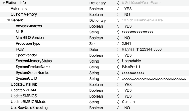 Die "xxx" müssen mit den eigenen SMBIOS-Daten aufgefüllt werden, die "ROM" bitte mit der Hardware-MAC-Adresse des ersten Ethernet-Ports auffüllen (nur die Zahlenwerte hintereinander ohne Doppelpunkt). SMBIOS-Daten neu generieren lassen kann man sich unter anderem mit dem Programm "Hackintool" unter System\Serial Generator.