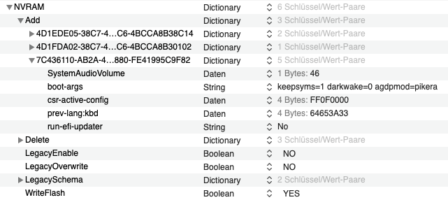 Hier gibt es diverse Einstellungen, wir wollen uns auf die Boot-Argumente beschränken. Eine allgemeingültige Aussage darüber, welche Einträge zu treffen sind, gestaltet sich schwierig. Mit den hier vorliegenden boot-args ist eine Basis geschaffen. Der erste Eintrag steht für "Keep symbols on Kernel Panic", der zweite schafft einen bestimmten Modus für den Ruhezustand und der letzte weist "WhateverGreen.kext" an, AGDP nach einem Patch von "Pike R. Alpha" zu modifizieren, "Board-ID" durch "Board-IX" zu ersetzen. Letzterer kann entfernt werden, wenn Probleme mit der Grafikkarte auftauchen.