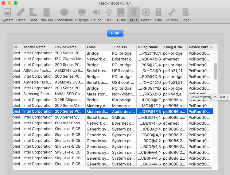 Wie kommt man nun überhaupt zu den Pfaden der gewünschten PCIe-Geräte? Hier helfen diverse Programme, zum Beispiel "Hackintool". In der Rubrik "PCIe" können wir uns sämtliche Geräte anzeigen lassen und nach belieben sortieren. Hier exemplarisch unser "HDEF". Ein Rechtsklick drauf, "Copy Device Path" angewählt, schon ist die Adresse in der Zwischenablage und kann in unsere config.plist eingesetzt werden.