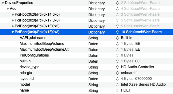 Werfen wir einen Blick in Device Properties, hier als Beispiel das Board-interne Audiodevice. Die Umbenennung des dahinterliegenden Devices "CAVS" (ACPI/DSDT Asus) zum Apple-konformen "HDEF" erfolgt durch eine Kext, da müssen wir nichts tun. Die Einträge selbst sind – wer bereits schon SSDT bearbeitet hat und "_DSM Methoden" kennt – selbsterklärend. Interessant ist, das egal welchen Typs wir hier deklarieren, zu diesem späten Zeitpunkt der Injektion ausschliesslich das Format "DATA" eingebunden wird. Benötigen wir darüberhinaus Einträge im Format "STRING" oder "NUMBER", so sind diese über eine SSDT vorzunehmen; diese Veränderungen der ACPI werden innerhalb der Bootphase deutlich früher abgearbeitet als OpenCores "DeviceProperties".