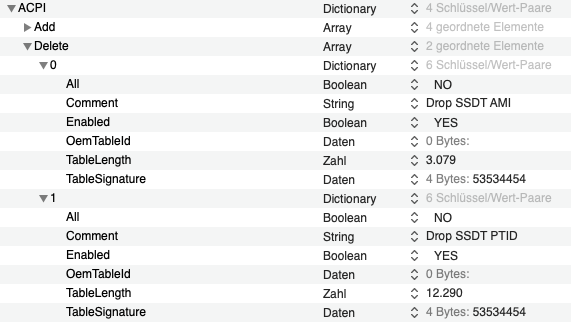 Die Konfigurationsdatei "config.plist" kann man mit beliebige Texteditoren öffnen und bearbeiten, empfehlenswert sind aber "echte" Plist-Editoren, wie zum Beispiel "Plist Edit Pro". Um vorhandene SSDT aus der ACPI des Mainboards zu unterdrücken (die sind natürlich weiterhin vorhanden, werden aber nicht geladen), schauen wir uns den Bereich "ACPI" an. Wir haben für die "SSDT AMI" eine bestimmte Bitlänge gefunden, so sieht dann der Eintrag dazu aus: