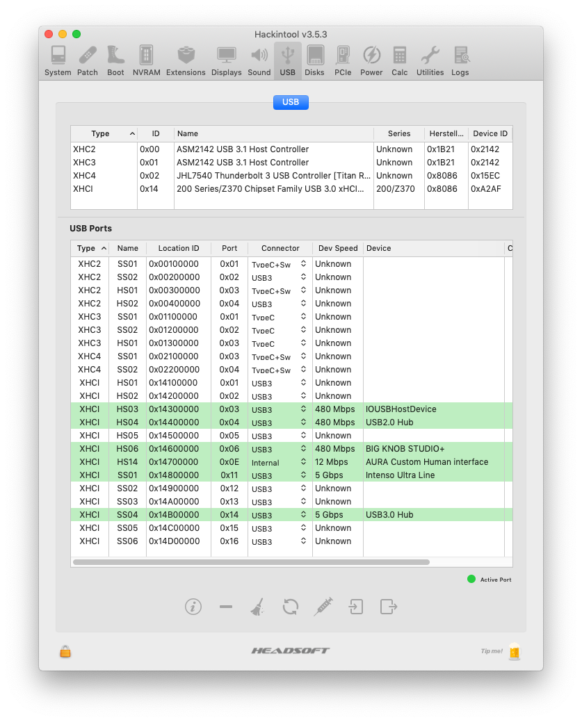Wir schreiben die aktiven und inaktiven Ports um, versehen sie mit den notwendigen Properties damit macOS "weiß", worum es sich handelt. Wie hier im Programm "Hackintool" zu sehen, sind die USB-Ports korrekt beschrieben über unsere SSDT, es ist somit keine extra "USB-Port.kext" notwendig (wobei wie im Bild zu sehen "XHC4" zu Thunderbolt gehört und nur dort auftaucht, wenn auch eine solche Karte eingesetzt ist):