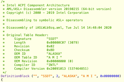 Da wir schon gelernt haben, "wo eins ist, darf kein zweites sein", müssen wir die originale SSDT aus der ACPI entfernen, diese soll in Zukunft nicht mehr geladen werden. Werfen wir deshalb nochmal einen Blick auf den Header der originalen "SSDT AMI".