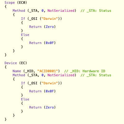 Darwin an sich ist der ursprüngliche, quell-offene BSD-Kern, die Basis von "Mac OS X". Es war damals ein freies UNIX-Betriebssystem von Apple und heute nur noch als Quellcode des jeweiligen Systems vorhanden, nicht aber (von Apple) Distributionen. Trotzdem erfolgt die Abfrage nach macOS auch bei echten Macs in deren ACPI mittels "Darwin". Somit können wir sicher stellen, dass unsere Manipulationen nicht etwa Windows betreffen. Neben der Deaktivierung von "EC0" erstellen wir ein "Dummy-Device" namens "EC". Dessen einzige Aufgabe ist es "da zu sein" und je nach verwendetem System einige Werte zur USB-Stromstärke zu bekommen, selbst ausführbar muss es nicht sein.