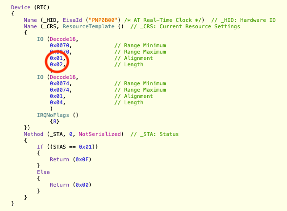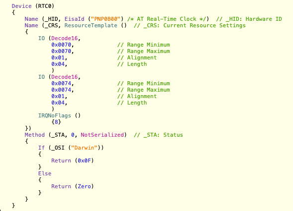 Das bietet uns die Chance, per SSDT ein fehlerbereinigtes "RTC0" einzubinden, denn "RTC" als Namen des Devices geht nicht mehr, es ist nunmal – ob aktiv oder nicht – im Code der DSDT enthalten. Und an ein und der selben Stelle kann eben kein zweites sein, wussten schon die alten Griechen.