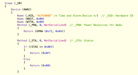 Schauen wir uns aus der ACPI zunächst die DSDT an. Ein Problem beim aktuellen BIOS (neben den Vorzügen der Aktualität) ist, dass hier ein neues Device eingeführt wurde: AWAC. Dieses neue "Time and Alarm Device" ersetzt in der Standardkonfiguration das altbekannte RTC. Letzteres ist aber für macOS wichtig. Ohne "Real Time Clock" geht's nun mal nicht. Ein bekanntes Verfahren ist, den Wert von "STAS" von "0" auf "1" zu setzen, um das ebenfalls vorhandene, aber deaktivierte RTC mit dem neuen AWAC auszutauschen.