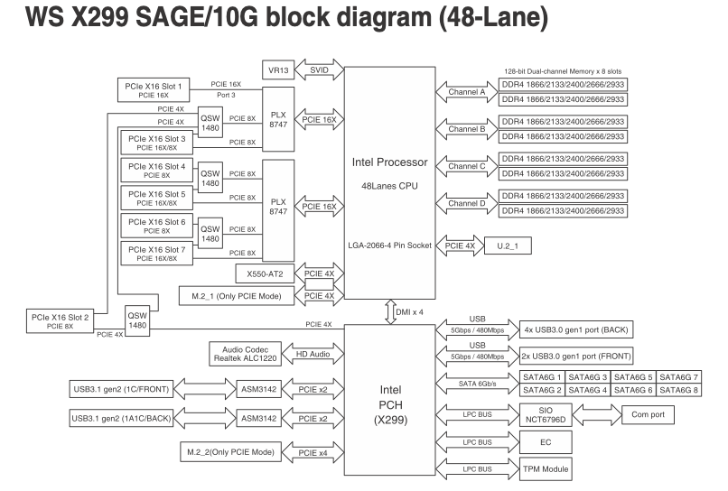 Das Interessante am SAGE sind die besonderen Chips, die PLX und QSW. Diese MultiPLeX- und Quick-SWitches fungieren vereinfacht ausgedrückt als "Verdoppler" und "Verteiler". Sehr gut zu erkennen ist im Diagramm, wie aus lediglich zwei x16 vom Prozessor die sieben PCIe-Slots bestückt werden.