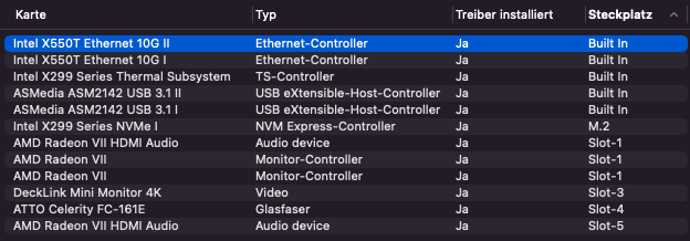 im 1x pci-e slot steckt momentan eine radeon r9 nano, wird eigentlich seit 10.13.x unterstützt, woran es aber bei einigen nutzern gelegeb haben soll.