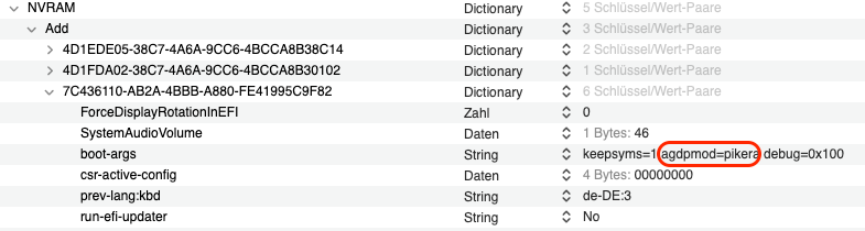 In der config.plist sollte noch je nach Grafikkarte entschieden werden, ob dieses Bootargument bleibt oder entfernt wird: