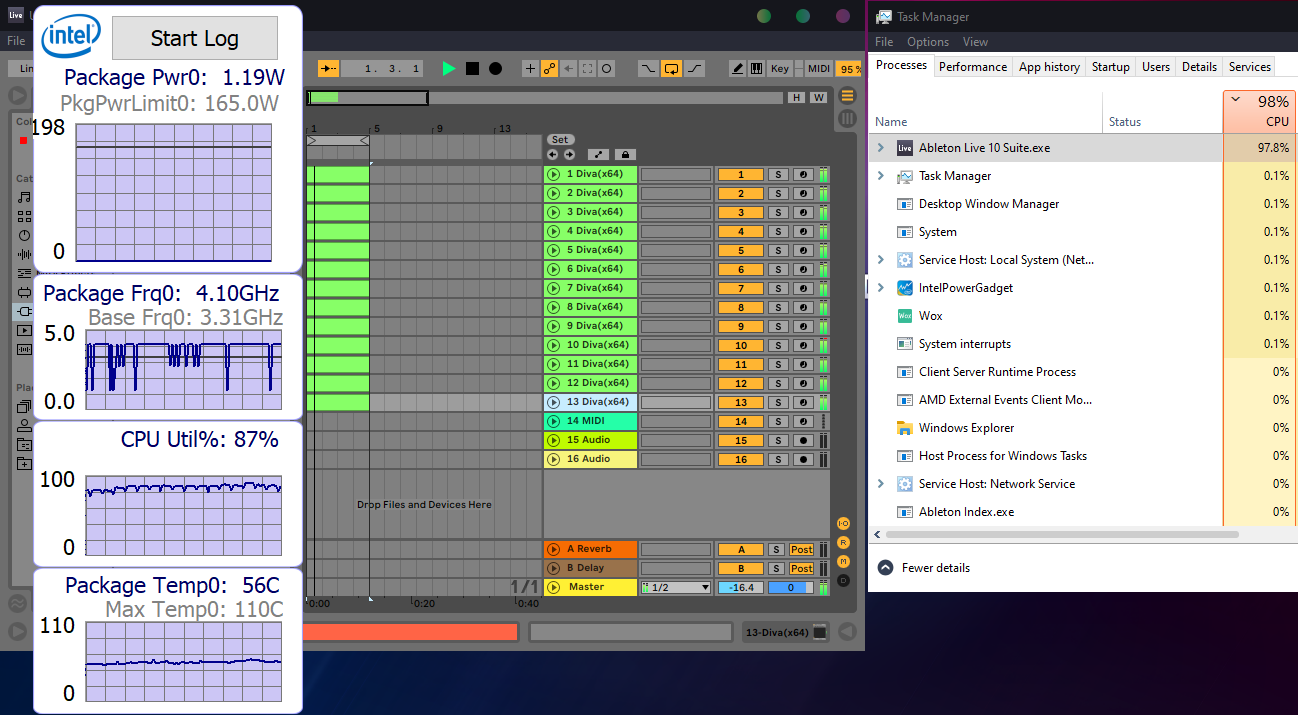 Anbei noch Screenshots. Für den Test habe ich ein sehr komplexes Preset mit einem 5-Stimmigen Akkordwechsel verwendet, daher so wenige Spuren. Ab jeweils einer weiteren Spur hat es bei beiden Systemen zu Dropouts geführt.