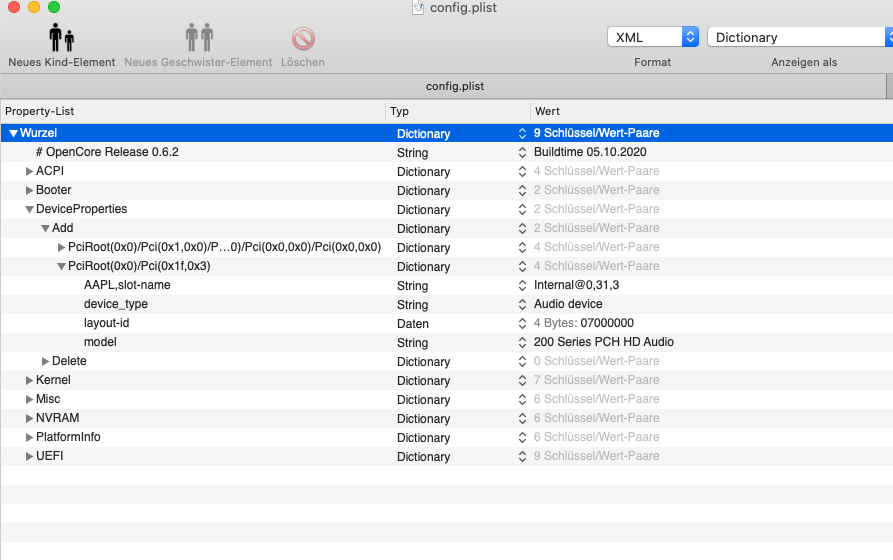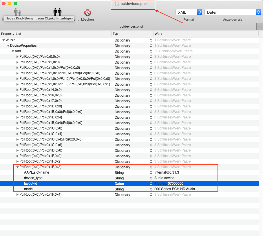 Die PciRoot Adresse ermittelst du mit dem Hackintool (oben in der Leiste auf PCIe klicken) und dann unten rechts auf Export. Anschliessend findest du auf deinem Desktop mehrere Dateien, darunter auch eine pcidevices.plist. Diese Datei mit PlistEdit Pro öffnen und ebenso deine config.plist. Dann suchst du dir im Plisteditor der pcidevices.plist deinen Audiocontroller aus, und ziehst ihn per drag&drop in deine ebenfalls geöffnete config.plist an die korrekte Stelle nach DeviceProperties->Add und fügst dann noch den Eintrag layout-id (falls nicht vorhanden) als Datenfeld hinzu.