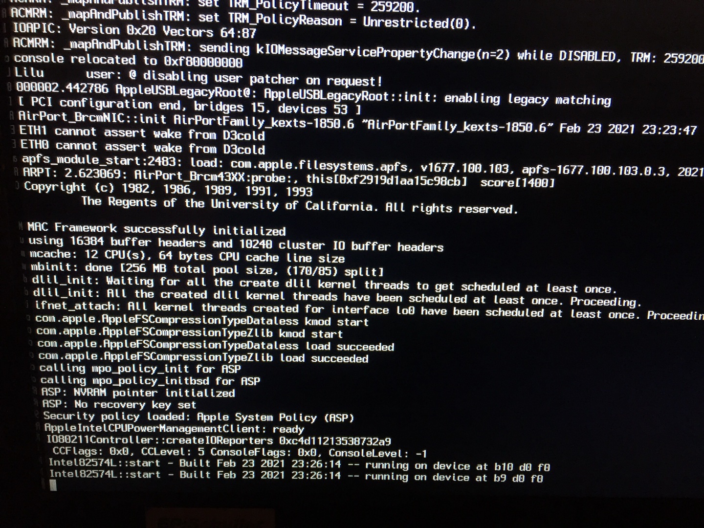 Die beiden Netzwerkports ETH0/ETH1 bereiten etwas Probleme. Oben bekommt er keinen "wake" eingerichtet, was immer auch "D3cold" ist, spricht aber dafür, dass dein Rechner keinen "Kalt"-Start meistert. Unten hängt er dann an den beiden Netzwerkcontrollern. Ein erneuter "Warm"-Start klappt dann (was technisch gesehen tatsächlich etwas anderes ist). Ich habe dafür aber keine Zeit, um das zu analysieren, meine Käsereibe dafür zu reaktivieren. Entweder könnte man in die DSDT schauen und mögliche Stolperstellen auskommentieren, oder per SSDT weiter Hilfe geben, oder vielleicht noch einfacher, vielleicht ist die OpenCore-Konfiguration noch nicht perfekt?