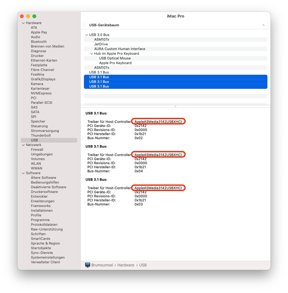 Was habe ich beobachtet? USB3.1 (ASMedia) hat in Big Sur eine eigene neue Kernel-Extension (?) bekommen, so sieht es normal aus: