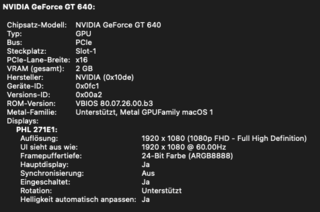 Sogar meine alte NVIDIA Ge Force GT 640 wird ohne Murren erkannt.Bin einfach nur Happy. Prost. Habe zwar DDR4 300 drin, aber er zeigt nur 2727 MHz an. Sprich für 324,00 Euronen I5-10400 LGA 1200, GA-460M D3H und 16 GB Speiche kann man nicht meckern. Glaube mit einer SSD M2,( mit 2 Steckplätze ) macht Das Bord so richtig Spass, wenn man einen schnellen Chipsatz kauft. Mal sehen was der Osterhase so bringt. die beiden schwarzen USB 2 Ports sind bei Big Sure tot.Aalso wunder Euch nicht wenn die Tastatur und die Maus nicht gehen. Aber das bekommen wir auch noch hin. Jetzt muss ich erstmal ein auf Familie machen. Wird schon rumgenerft. Nochmals Dank für die Hilfe.