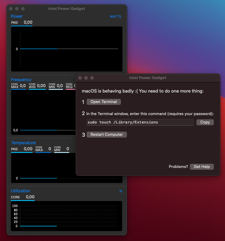 Unter Big Sur hat Intel Power Gadget bei mir bisher weder auf meine Notebook noch auf meinem PC funktioniert.
