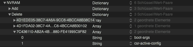 WICHTIG: Damit man nach der Änderung des CSR-Werts und Neustart nicht jedes Mal einen NVRAM Reset durchführen muss, unter NVRAM > Delete > 7C436110-AB2A-4BBB-A880-FE41995C9F82 csr-active-config als Parameter hinzufügen:
