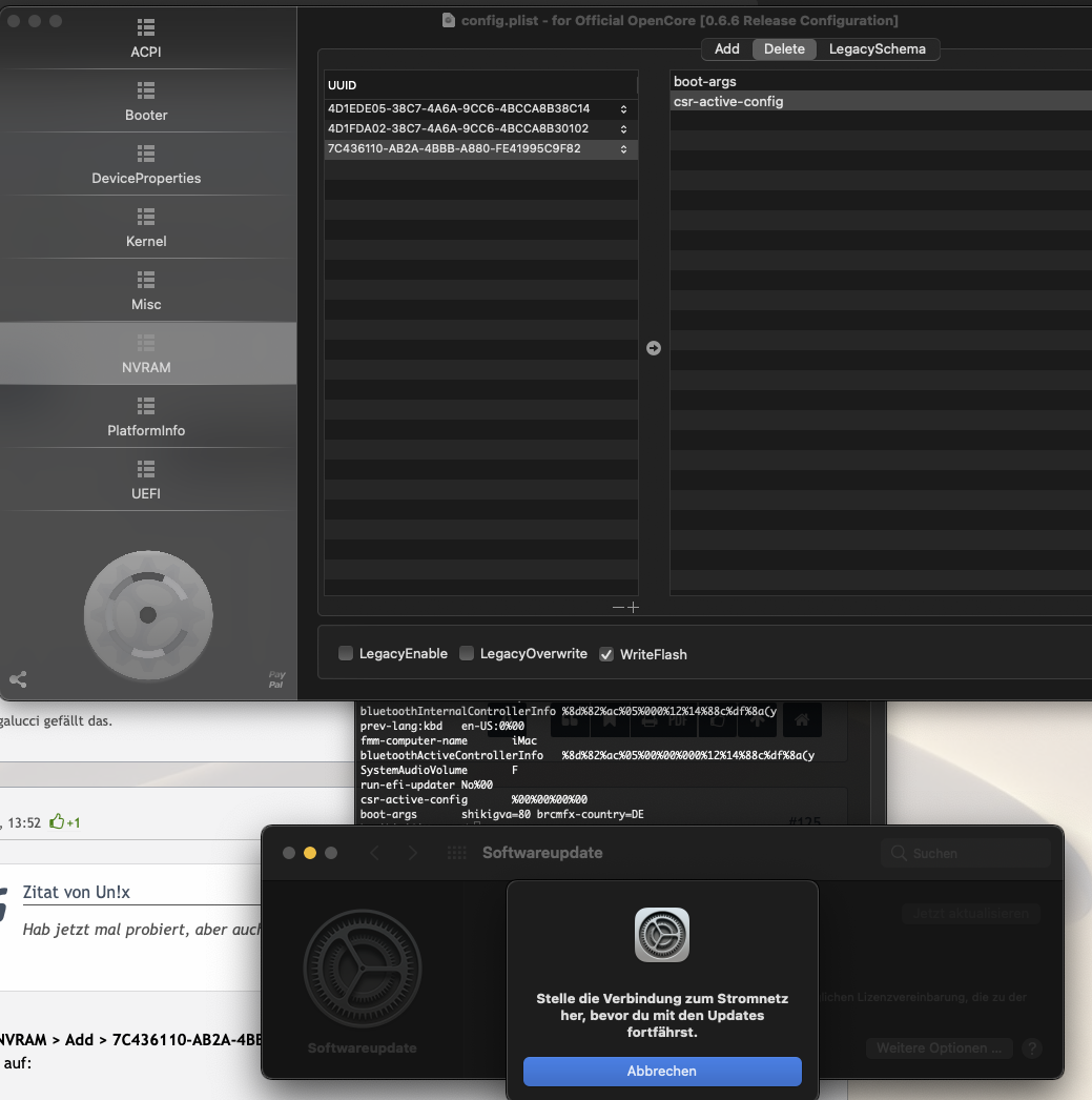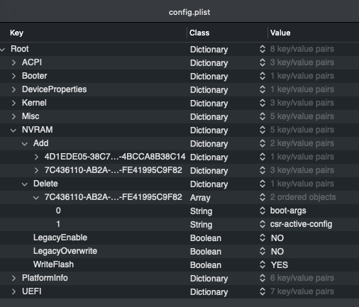 Sehe ich genau so. Diese "gebetsmühlenartige" Empfehlung etlicher Nutzer, ständig bei einem x-beliebigen Problem den Inhalt des NVRAM zu löschen, finde ich auch bedenklich. Zumal je nach Plattform, konkreten Mainboard nebst BIOS-Version, BIOS-Einstellungen und zusätzlichen ACPI-Fixes, das globale Löschen des NVRAM empfindliche Auswirkungen haben kann, davon sind "zurückgesetzte Boot-Einträge" im BIOS noch "harmlos". Wenn mein USB nicht wie erwartet funktioniert, hilft kein NVRAM-Reset. Möchte man eine grafische Anzeige, welche Variablen gerade mit welchen Werten gesichert sind, so kann sehr einfach das Programm "Hackintool" in dessen Rubrik "NVRAM" helfen. Hier können auch gezielt einzelne Einträge entfernt werden (oder wenn man mag, auch neu gesetzt oder geändert werden). Und OpenCore bietet, wie schon beschrieben, mit "Delete" eine hervorragende Möglichkeit, "vor" dem Setzen eines neuen Wertes den vorhandenen zu löschen.