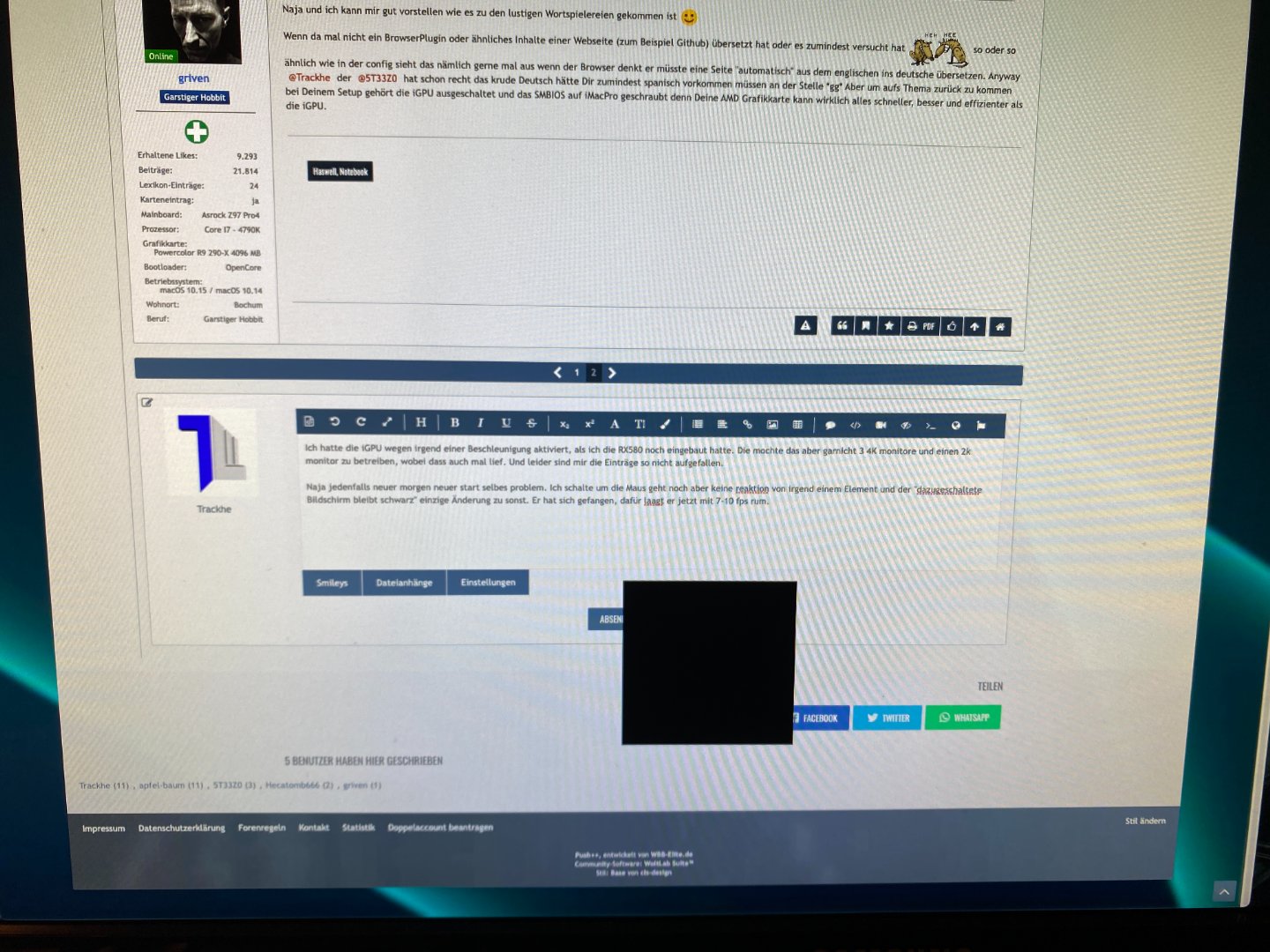 Wenn da mal nicht ein BrowserPlugin oder ähnliches Inhalte einer Webseite (zum Beispiel Github) übersetzt hat oder es zumindest versucht hat [hehee] so oder so ähnlich wie in der config sieht das nämlich gerne mal aus wenn der Browser denkt er müsste eine Seite "automatisch" aus dem englischen ins deutsche übersetzen. Anyway Trackhe der 5T33Z0 hat schon recht das krude Deutsch hätte Dir zumindest spanisch vorkommen müssen an der Stelle *gg* Aber um aufs Thema zurück zu kommen bei Deinem Setup gehört die iGPU ausgeschaltet und das SMBIOS auf iMacPro geschraubt denn Deine AMD Grafikkarte kann wirklich alles schneller, besser und effizienter als die iGPU.