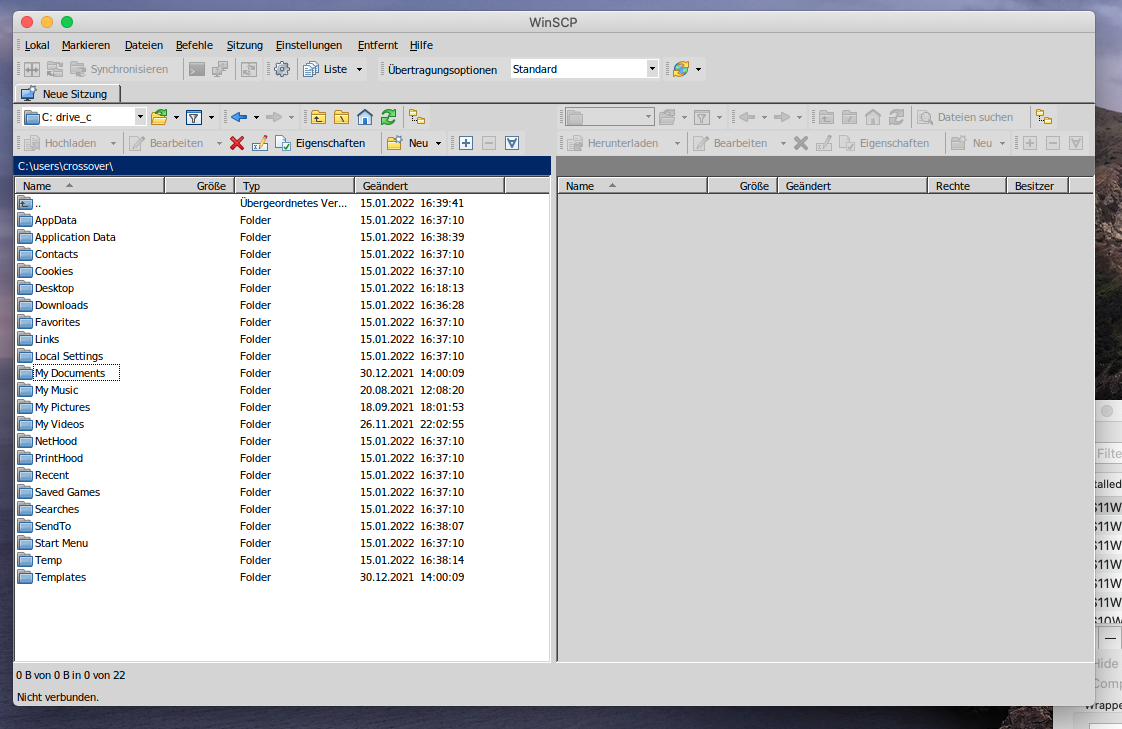 Hi Ihr, ich suche quasi nach der WinSCP-Antwort für den Mac. Cyberduck, WinSCP in Wine einpacken, Forklifter, muCommander, Commander One klappt nicht. Fugu müsste ich kompilieren, da bin ich ahnungslos- Tja, ich hätte nicht gedacht, dass es so ein schwieriges Unterfangen ist mit meinem Hackintosh auf den gehackten Staubsauger (mit grafischen GUI) zu kommen, was mit Windoof so easy klappt.