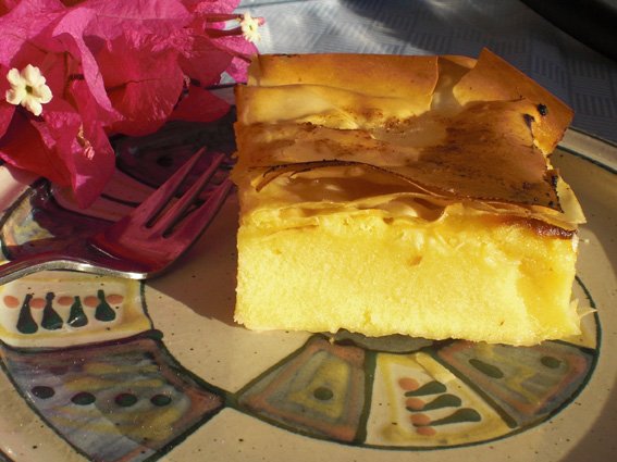 Galaktobureko ist mein absolutes Lieblings-Dessert aus der griechischen Küche. Im Original wird es mit Filoteig gemacht, und zwar nicht nur oben drüber, sondern komplett eingeschlagen. Zuckersirup ist ein Muss und es gehört normal auch noch dünn aufgeschnittene kandierte Orange drüber. Ich empfehle auch in die Füllung etwas Orangenabrieb zu geben, wertet das ganze nochmal auf. Mein Grieche um die Ecke macht es auch so.