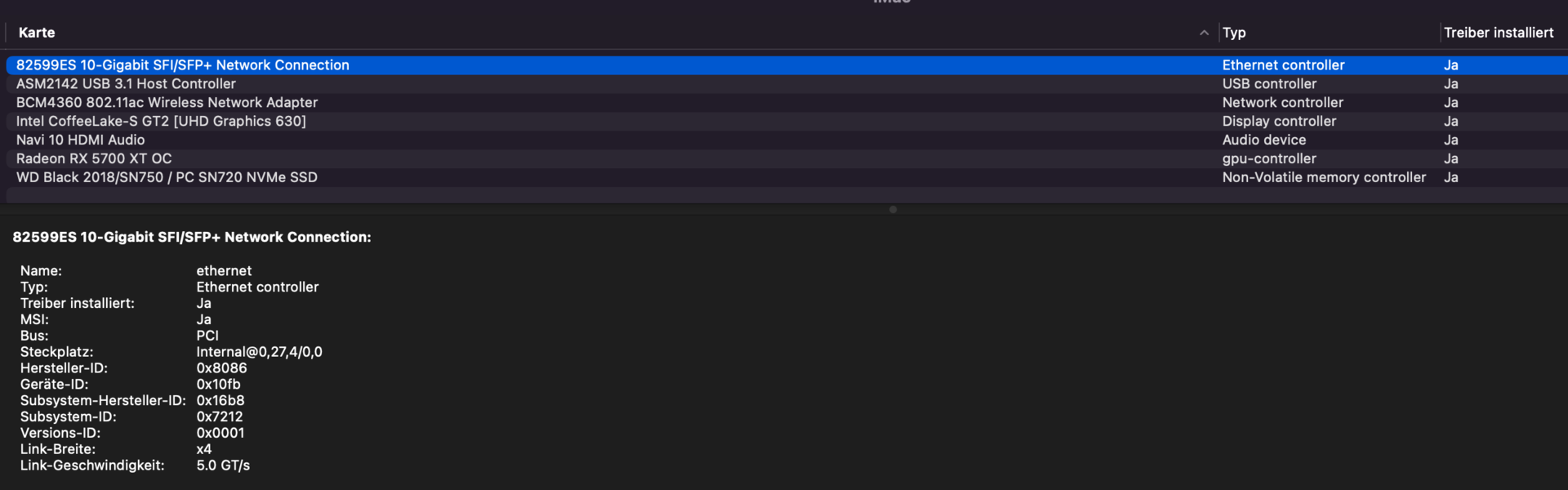 Angeschafft hatte ich die Karte, da diese denselben Chipsatz wie die Sonnet Presto Twin 10G SFP+ besitzt. Intel 82599ES. Für diese ist ein Treiber von Sonnet vorhanden.