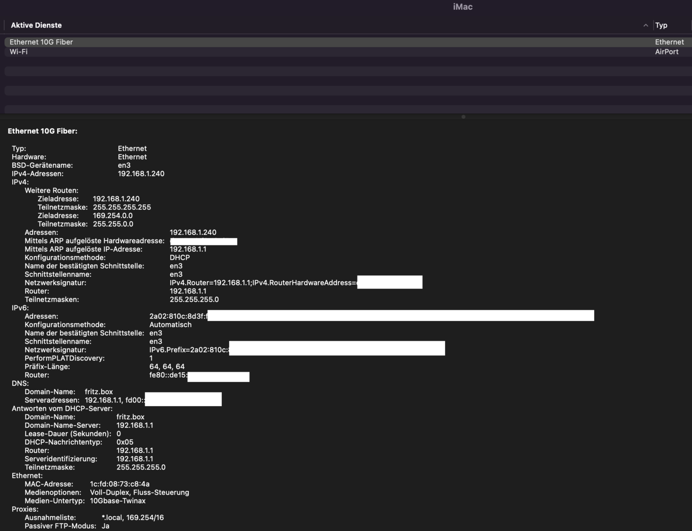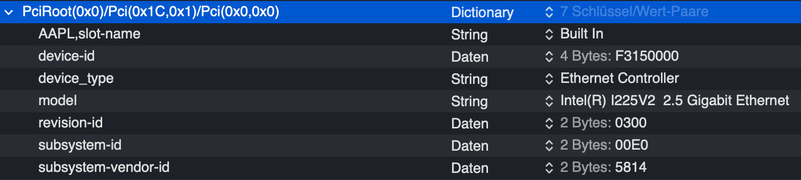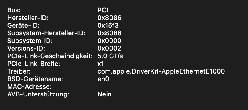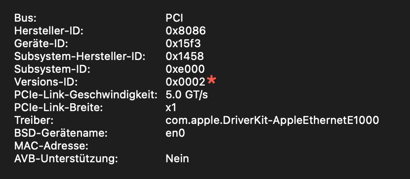 Beim ersten Boot des Rechners mit angeschlossenem Glasfaberkabel hatte ich erstmal eine Kernel Panic was mich etwas stutzig machte. Den Sonnet Treiber hatte ich noch gar nicht installiert. Somit war aber klar, dass die Karte von Haus aus unterstützt wird. Mit aktivierten VT-D im Bios und DisableIOMapper=False/No klappt es aber auch ab 12.3 mit Apples eigenen Treibern. Dort wird auch der Netzwerkdurchsatz in der Aktivitätsanzeige dargestellt. Welcher Treiber genau genutzt wird, konnte ich bisher nicht ausfindig machen. Hauptsache es läuft ![]()
