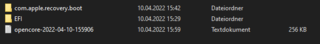 • Ja also habe die Big Sur Datei runtergeladen.. Dann wie beschrieben den Stick gemacht und auf dem Stick einen Ordner mit dem Namen : com.apple.recovery.boot gemacht. Dann den EFI Ordner aus Opencore rüber kopiert und in den Ordner mit com.apple.recovery.boot die BaseSystem und Chunklist File reingemacht. Baer beim auswählen in OpenCore steht nur Windows