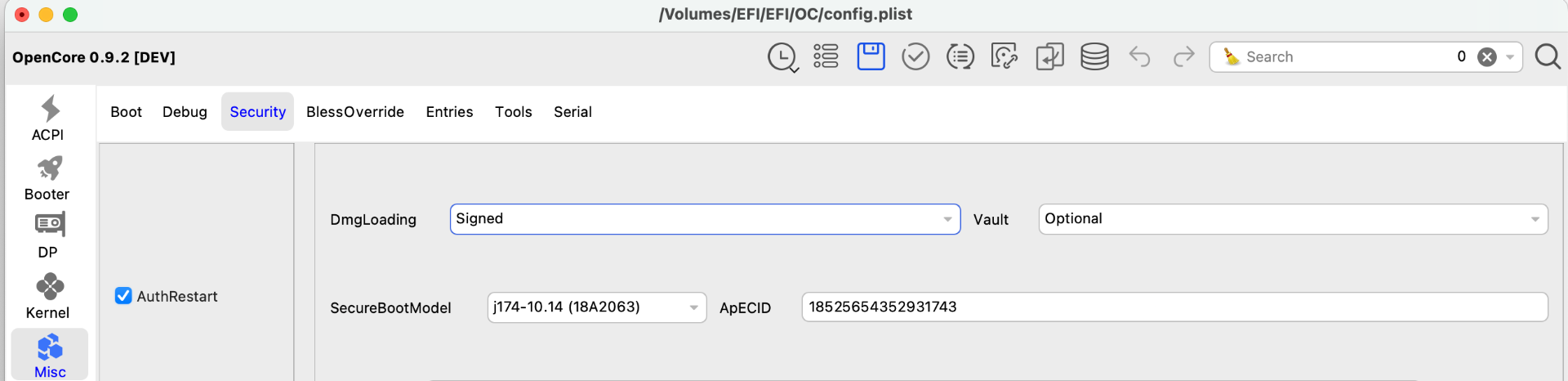 Stell SecureBootModel auf Default und nimm den Wert für ApEICD komplett raus und mach dann einen NVRAM Reset (Just to be Sure) und dann sollte es passen.