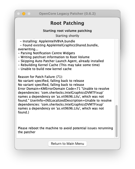 EDIT: Leider 0.6.2 mit gleicher Fehlermeldung. Habe jetzt Kexte und OC komplett auf Nightly umgestellt, -lilubetaall zugefügt und melde mich dann später mit Ergebnissen.