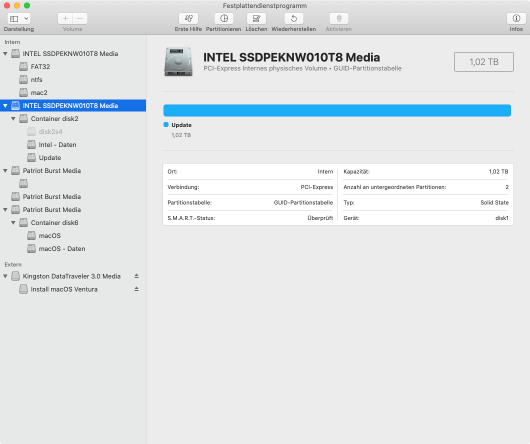Um sicher zu gehen, dass meine bisherige Konstellation ganz sicher unversehrt bleibt, habe ich bei allen drei SATA-SSDs das Stromkabel abgezogen. Dadurch waren während der Installation nur die beiden NVMe-SSDs existent. Eine der beiden war in 4 Partitionen aufgeteilt, auf der Daten liegen, die ich behalten möchte, die andere ist dafür vorgesehen, OpenCore und Ventura aufzunehmen.