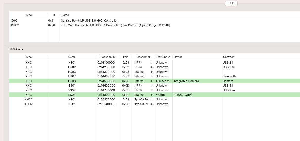bei mir stimmte die genaue Zuordnung der einzelnen Ports USB2, USB3, internal nicht genau. Außerdem waren einige leere Dummys dabei, also Weiß markiert. Das lässt sich mit HackinTool nacharbeiten.