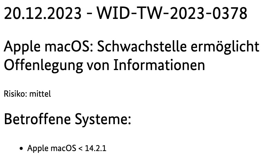 Dann einfach in den Systemeinstellungen stumpf auf das angebotene Sonoma 14.1.2 Systemupdate gedrückt.