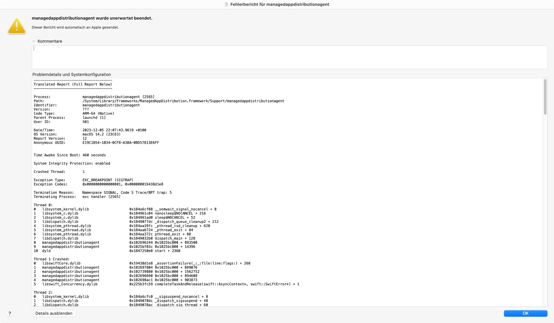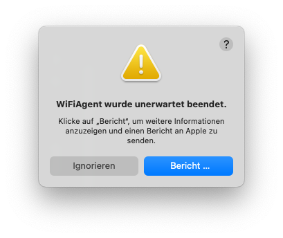 Der WiFiAgent wurde unerwartet beendet. Da der wie alle meine Sonoma-Rechner WiFi gepatched hat, werd ich diese Meldung allerdings nicht an Apple senden. Und die andere nervt immer noch genauso: