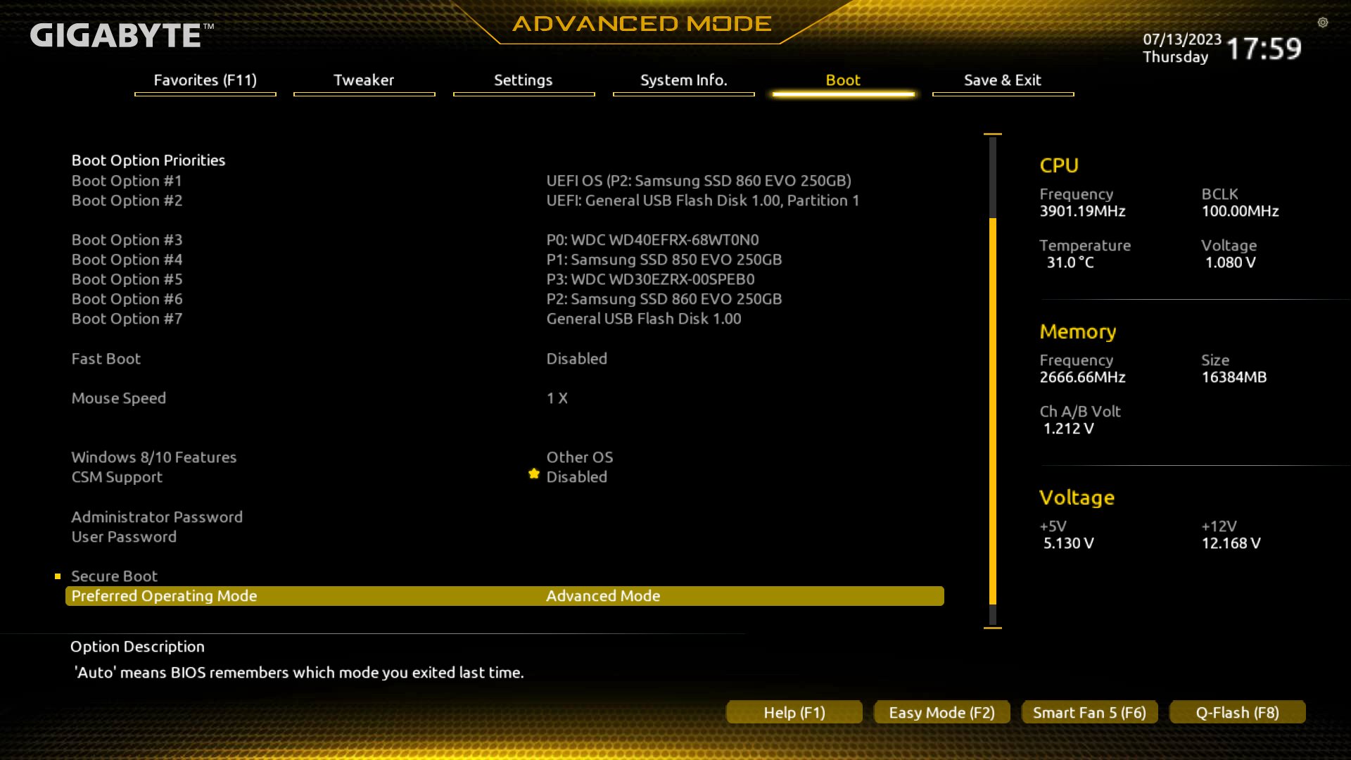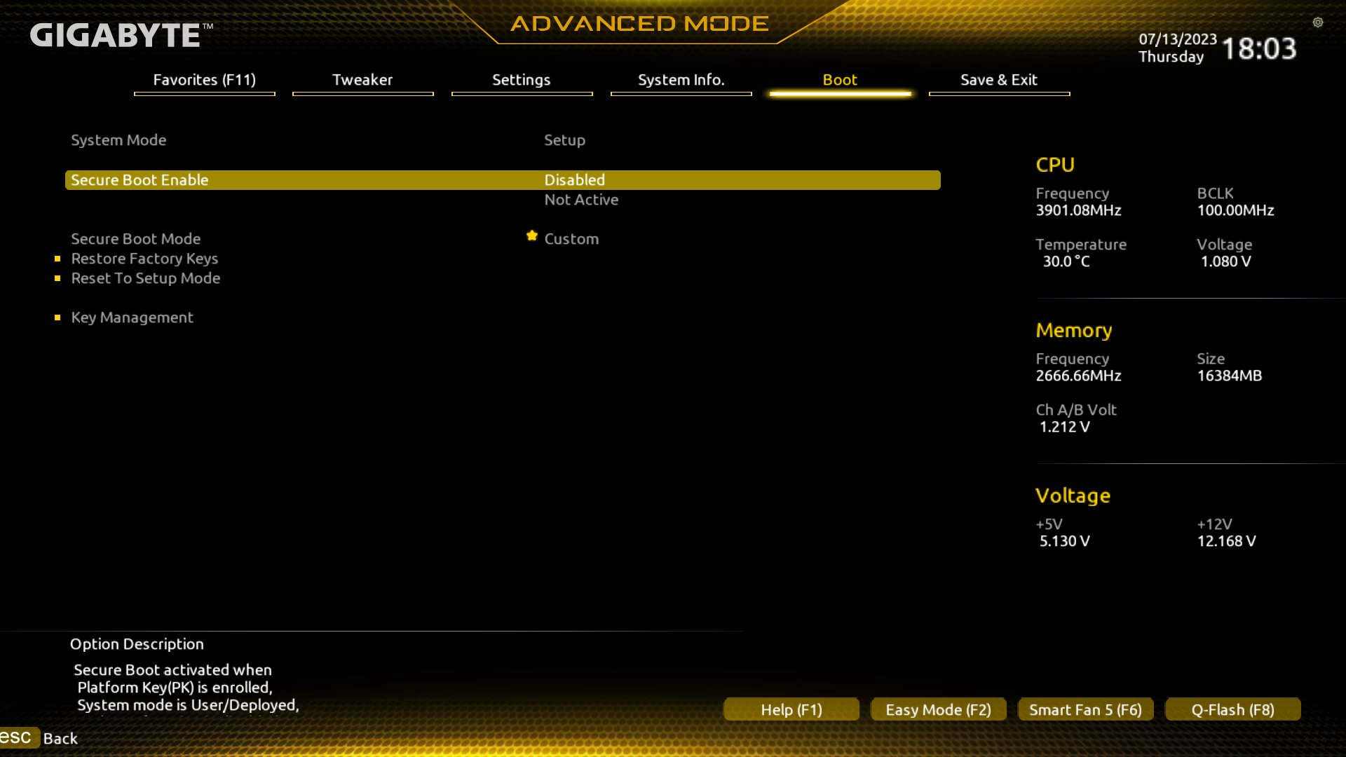 HINWEIS: In meinem BIOS habe ich erst CSM disbaled, dann erst erscheint Secure Boot - das dann auf disabled gesetzt -> CSM wieder aktiviert (mein Win ist noch alt und bootet noch per CSM)
