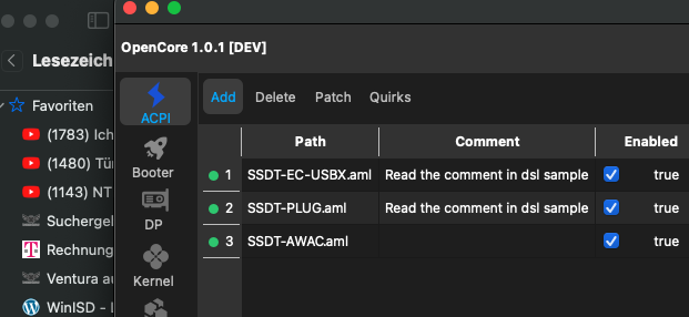 - OpenCore 1.0.0 mit den neusten Dateien (BOOTx64.ef in Boot/, HfsPlus.efi und OpenRuntime.efi in OC/Driver/, oben erwähnte zwei SSDTs in OC/ACPI/, optionale Tools wie CleanNVRAM.efi, OpenShell.efi und ResetSystem.efi in OC/Tools/),