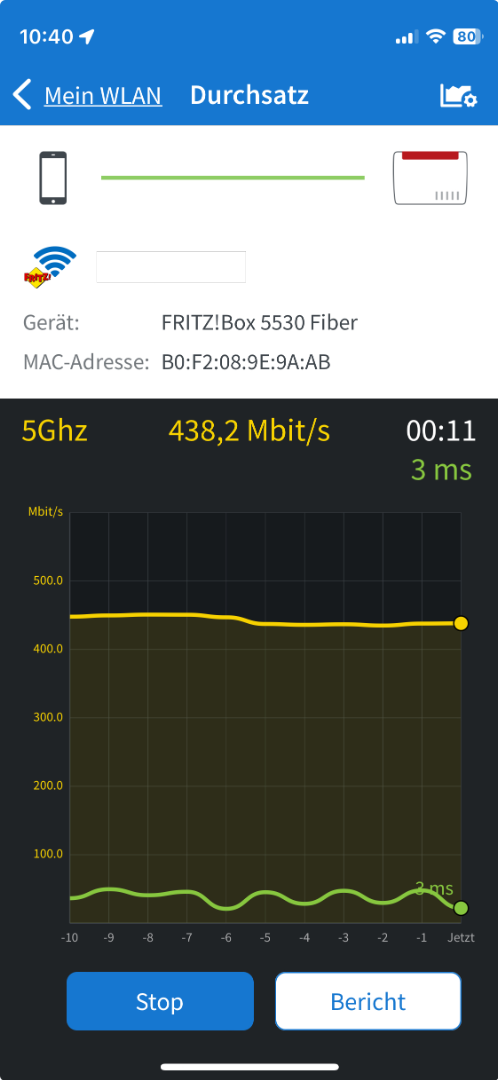 Das iPhone 12 mini misst mit der AVM-App durchgängig > 400 Mbps.