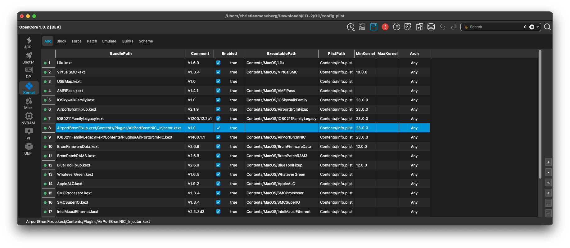 • aus meiner Erinnerung zum T470 hatte ich die Reihenfolge bei der dort verbauten DW 1560 wie im Bild. Der AiportFixup.kext muss m.E. vor dem Plugin AirPortBrcmNIC_Injector.kext stehen und dieses vor dem IO80211FamilyLegacy.kext/Contents/PlugIns/AirPortBrcmNIC.kext.