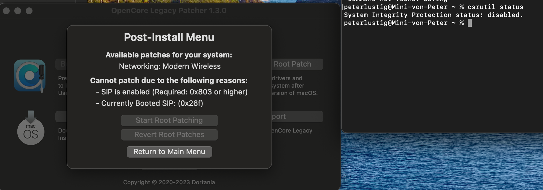 Also: Trotzdessen das ich SIP off habe, über den Efi SIP Toggle Treiber und auch im Terminal mit CSRUTIL STATUS = disabled steht, kann ich den Patcher nicht zurück drehen.