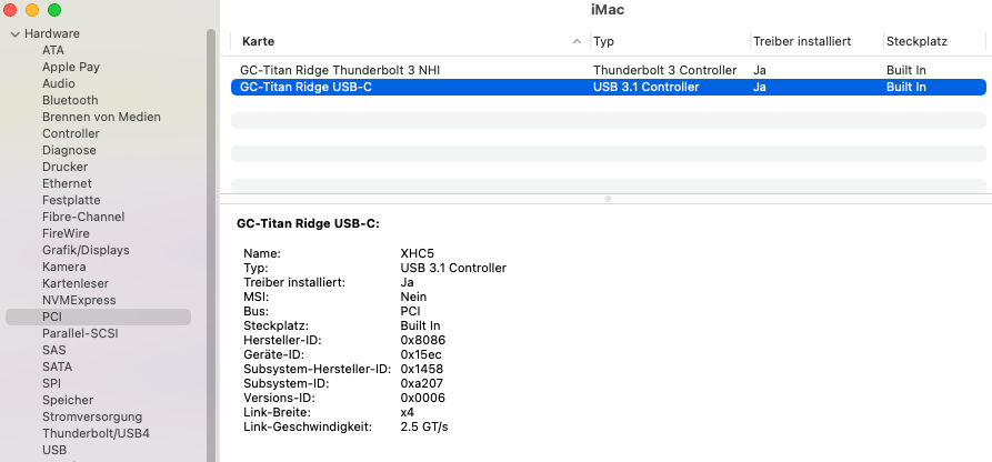 Im Systembericht unter dem Menüpunkt PCI zeigt er die Karte an und sagt, es wären Treiber installiert.