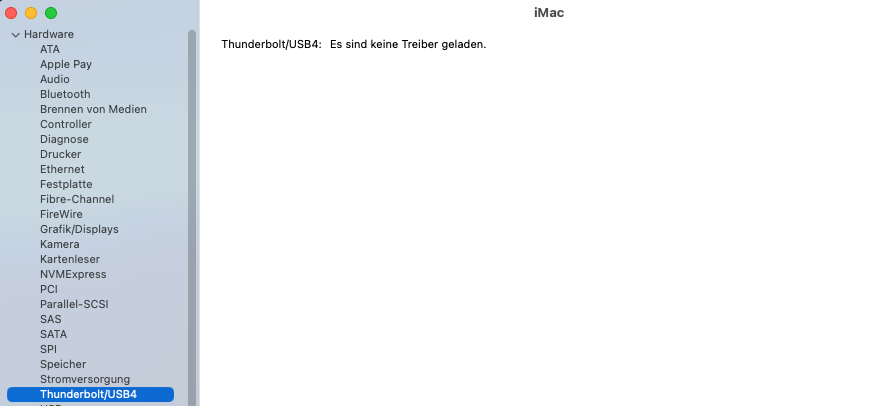 Unter dem Menüpunkt Thunderbolt/USB4 zeigt er folgendes an: "Thunderbolt/USB4: Es sind keine Treiber geladen."