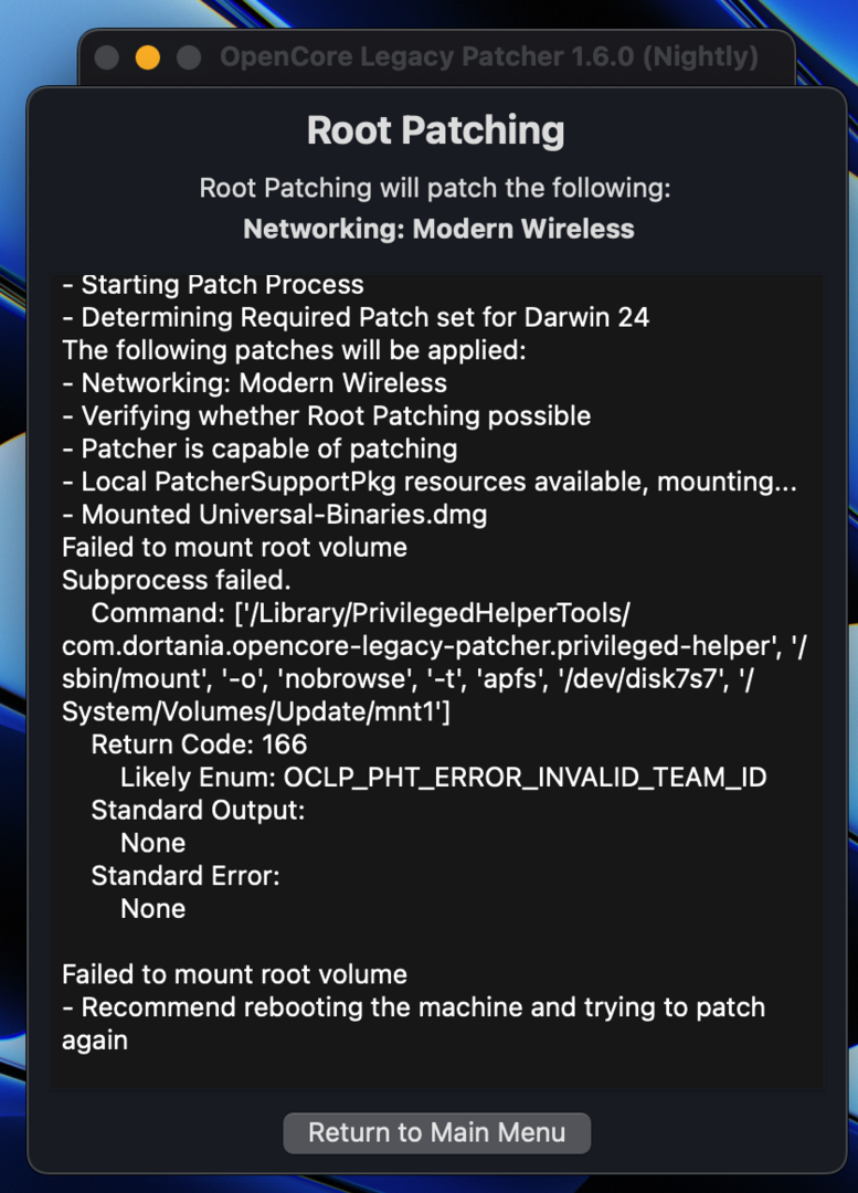 • Wenn ich es mit dem neuen nightly patcher versuche, bekomme ich die Meldung, dass er das root volumen nicht mounten kann.